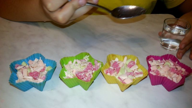 Масата се изсипва в калъпи. Когато се вземат пластмасови форми, те се смазват с растително масло. Течната маса остава във формите до окончателното втвърдяване.