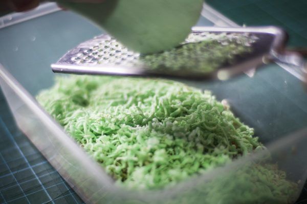 - Нарежете останалата част от сапуна на кубчета. Добре е, когато излизат с еднакъв размер, за да се топят равномерно. Друг вариант е да настържете продуктите с ренде, като ги накълцате възможно най-фино.