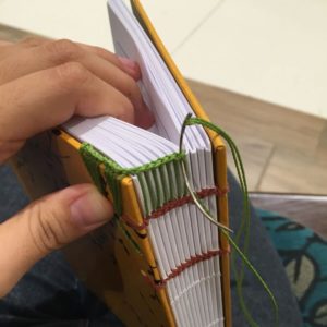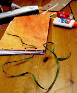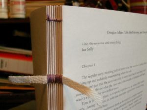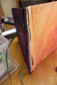 - Натопете четка в лепило и нанесете върху пънчето с разрезите. Уверете се, че лепилото не е попаднало в прореза. Накиснете въжето в лепило, поставете въжето в прореза, като краищата му трябва да стърчат на 3 cm. Издърпайте краищата и въжето ще се фиксира в прореза. Нанесете лепило върху кочана и залепете марлята, а след това и капталите. Върху капталите нанесете лепило и залепете хартиена лента, като я изгладите до гръбнака. Оставете да изсъхне напълно през нощта.