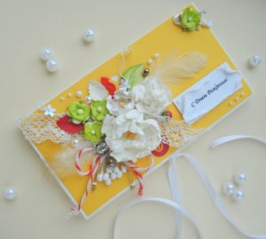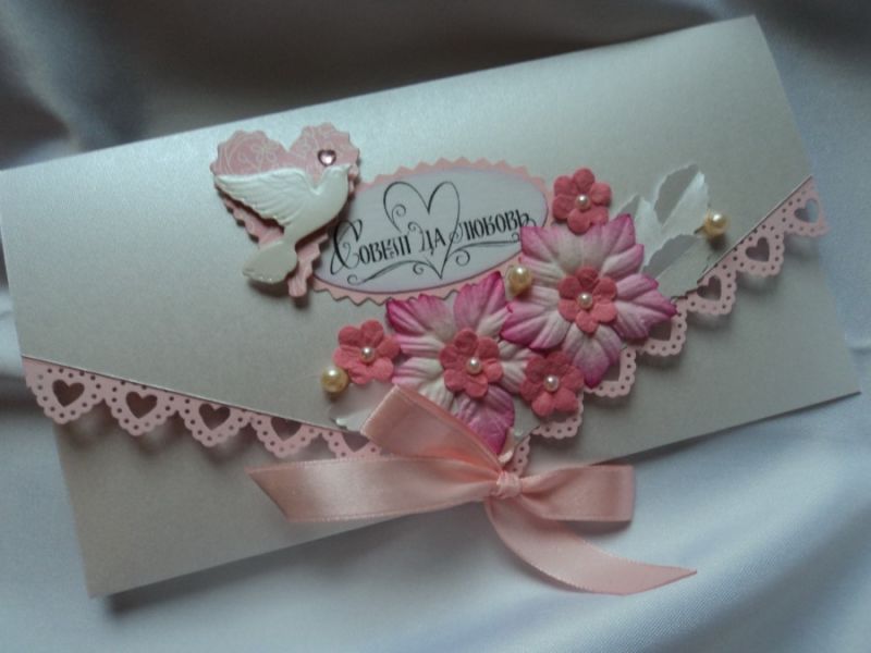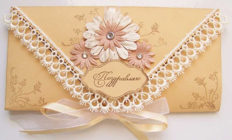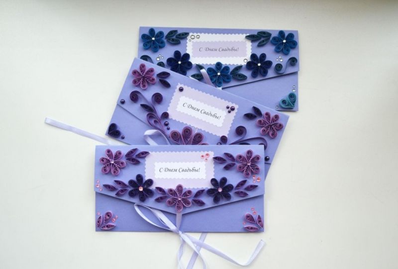 Можете да използвате и по-обемни декорации: пайети, кристали, мъниста, готови панделки, декорации за скрапбукинг, пеперуди и цветя в техниката квилинг. Но пликът трябва да бъде украсен с оглед на непосредственото му предназначение, т.е. опаковане на парите.