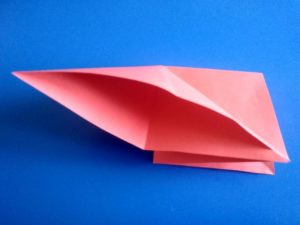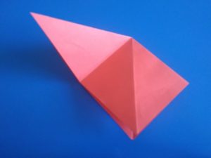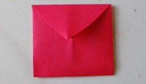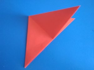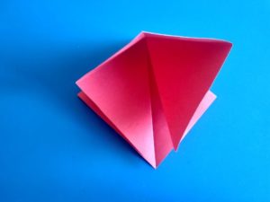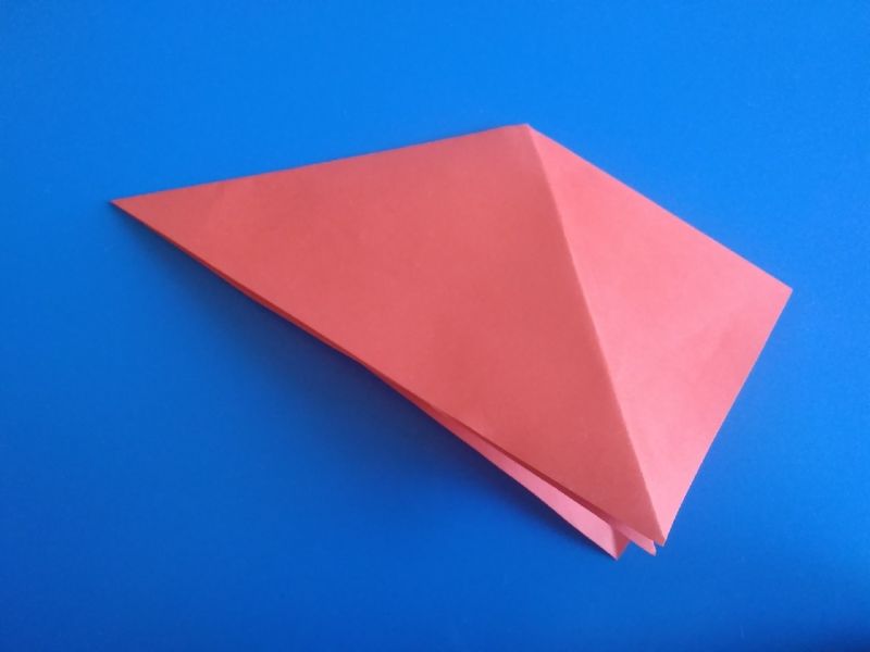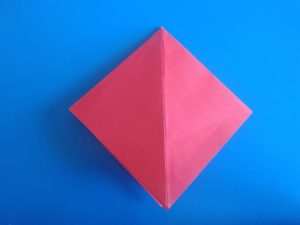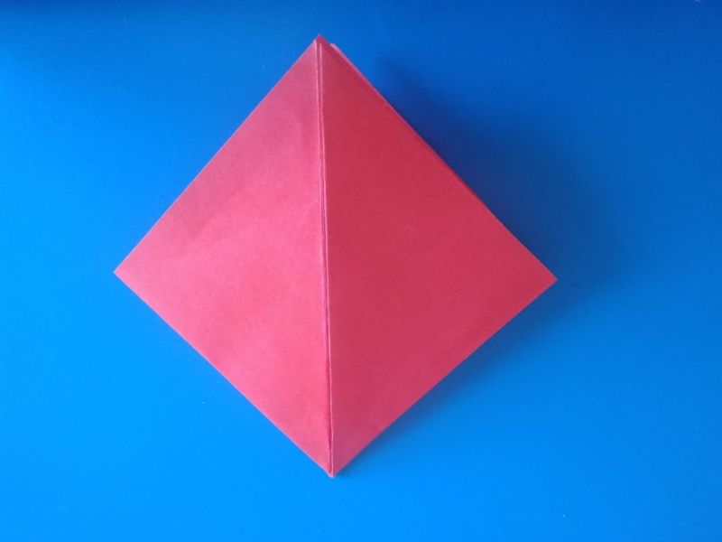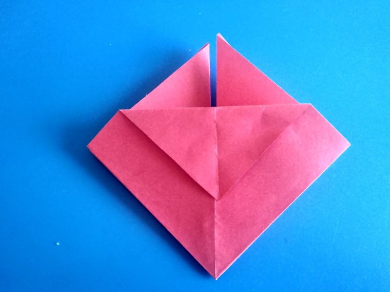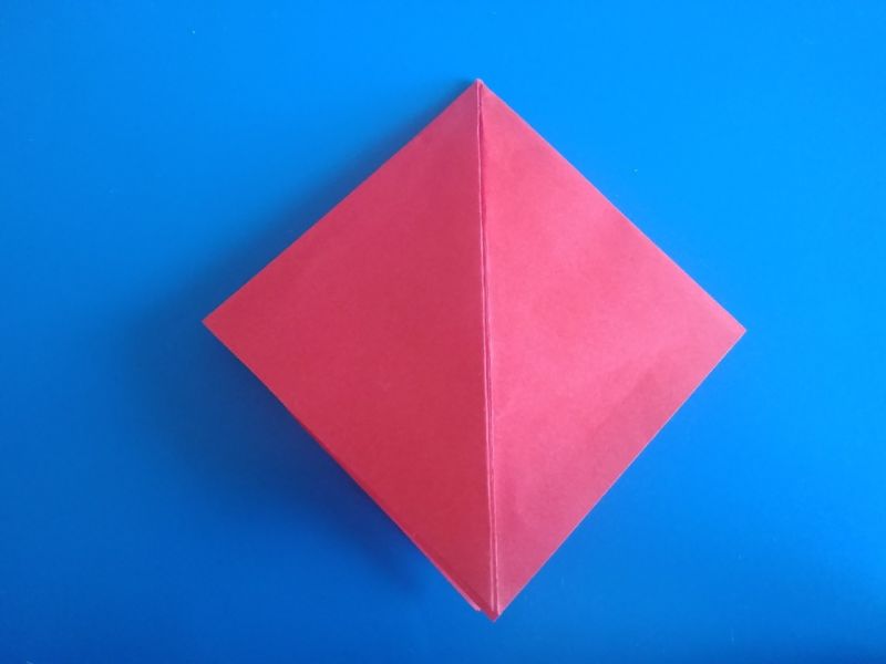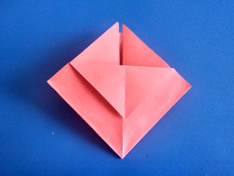 - Прегъвайте последователно първо единия, после другия ъгъл, така че да преминат един през друг и да образуват квадратна форма на линиите на прегъване отвътре, а горната част да е подобна на ромб с равни страни.