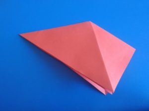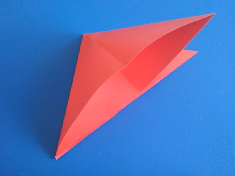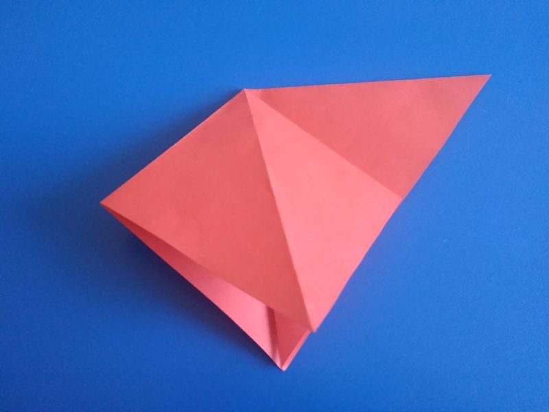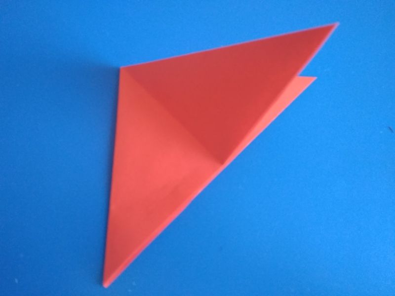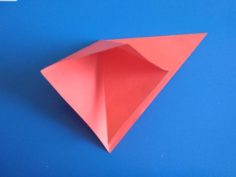 - Сега част от хартията в горната и дясната част се сгъва в посока, обратна на триъгълника, така че да го съедини.