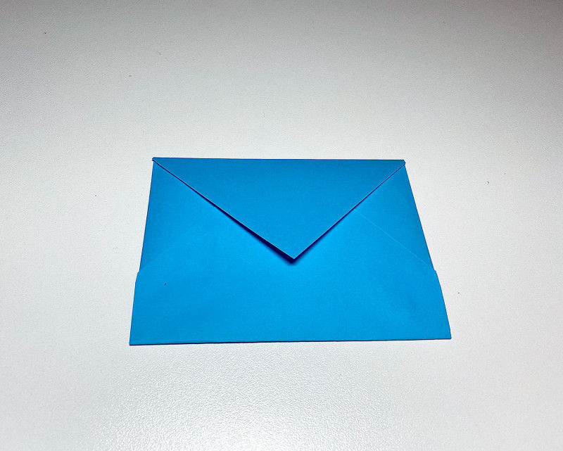 - Закрепете сгънатите ъгли с лепило. Горният ъгъл се спуска надолу, така че да достигне точно до ръбовете на долната част на фигурата. Пликът е готов. Ако желаете, направете закопчалка със стикер.