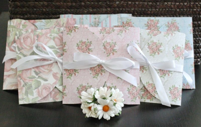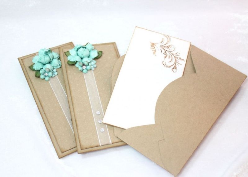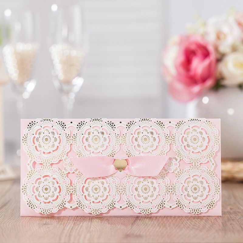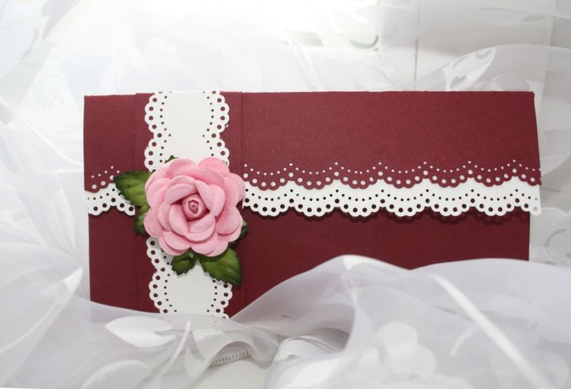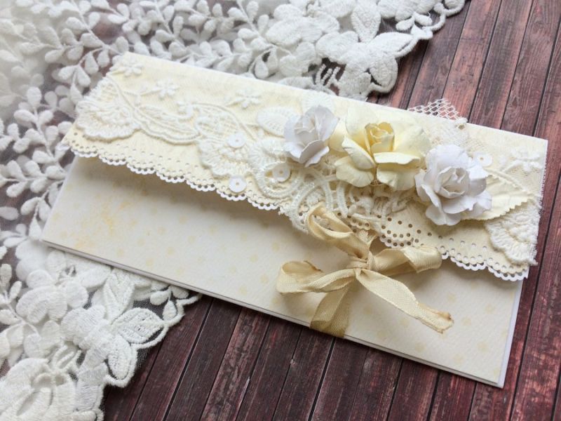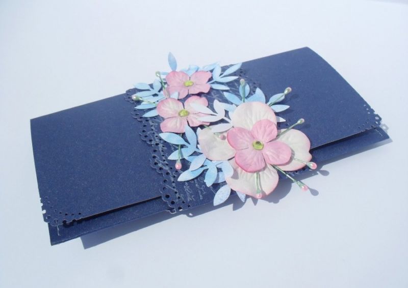 - Пликът, затворен с венчелистчета, е фиксиран със сатенена панделка, за да не се загуби визитка, карта или пари.