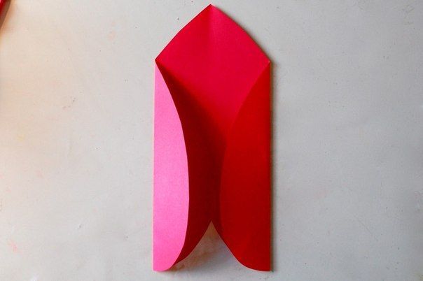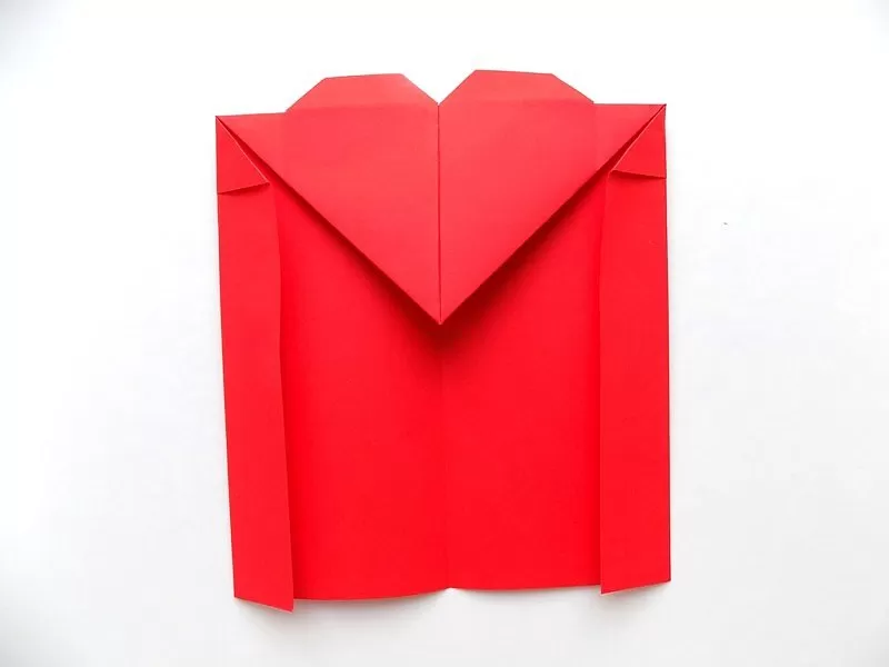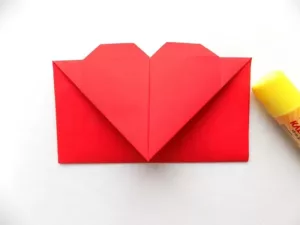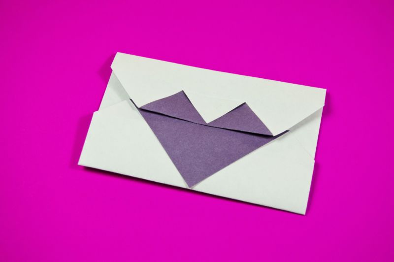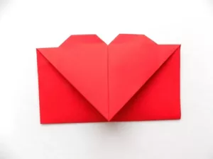 - Триъгълният капак на сърцето се сгъва нагоре, а долната част на модела се сгъва до горната гънка. Закрепете страните на плика отвътре с лепило или двустранно залепваща лента.
