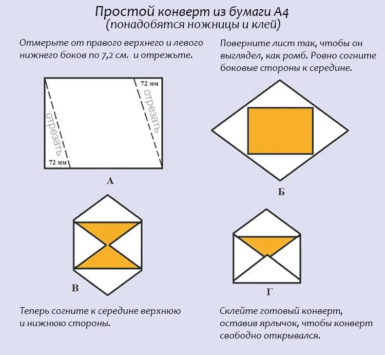 Най-лесният начин за създаване на плик с правоъгълен капак е да сгънете и залепите лист хоризонтална хартия или лист А4. За работата ще са ви необходими само хартия и лепило.