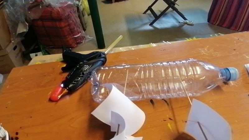 Необходими елементи: пластмасова бутилка, дървено шишче, хартия, конец, отвертка. Вместо бутилка можете да използвате кутия от сок, кофичка от кисело мляко или кенче.