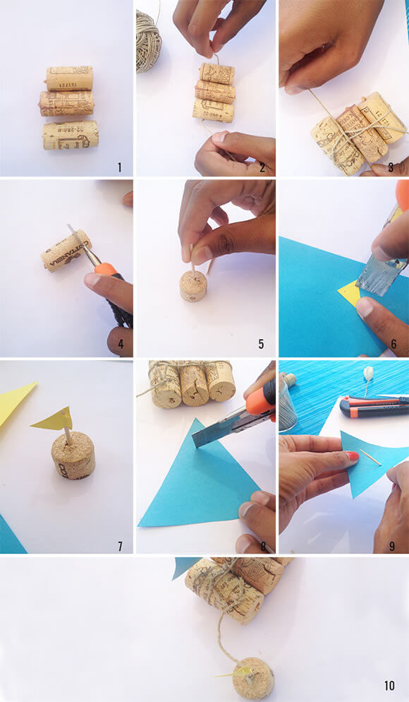 Ще ни трябват: винени тапи, конец, игла, хартия, клечка за зъби.