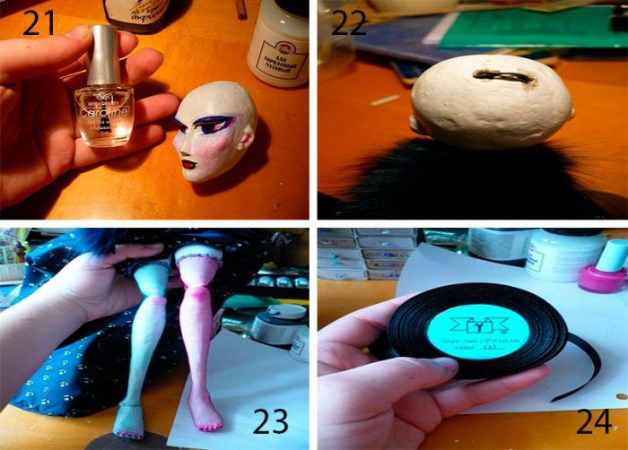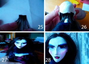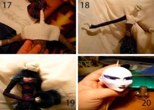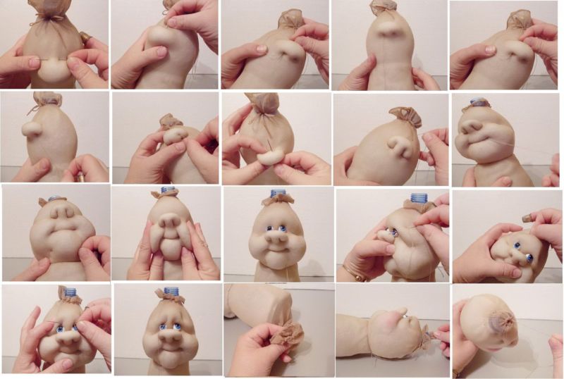 - С помощта на шило направете дупки в главата на куклата над лицето.
