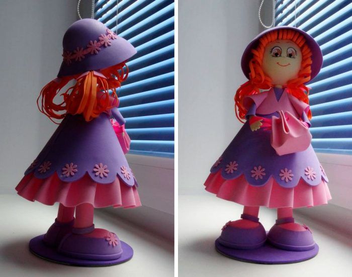 - Залепете шапката от полукръга лилаво от. Украсете куклата с мъниста.