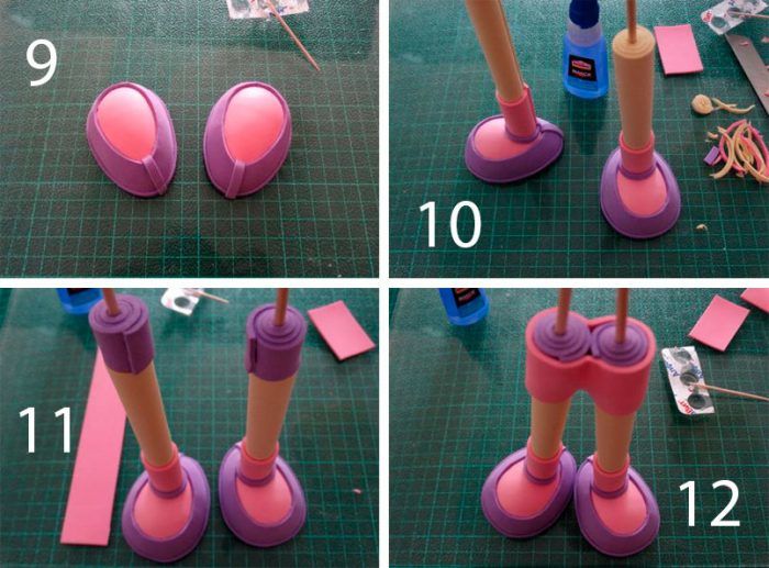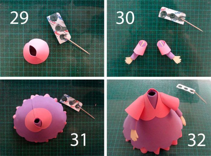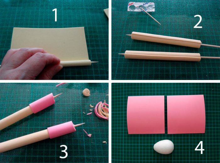 - Изрежете дръжки с правилен размер (малки овални форми с длани) от с телесен цвят fom. Увийте ги, с изключение на дланите, в лилави правоъгълници с размери 3х5 см.