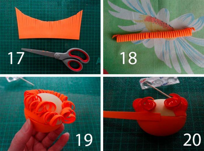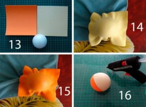 - Загрейте портокала foamiran както по-горе, нанесете от едната страна на топката, отстранете излишното количество, залепете — коса. По същия начин Foamiran Върху обратната страна на топката направете лице в телесни тонове.