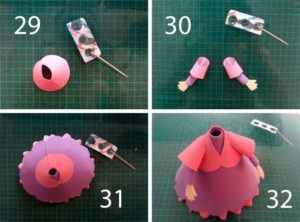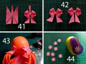 - Лукчетата се правят от квадратчета от розово FoamiranПанделките са направени от квадратчета розово фолио, изрязани по диагонал. Сглобете триъгълниците, получени от панделки, залепете ги към тесните ленти. — на дъното му. Прикрепете панделки към опашките.