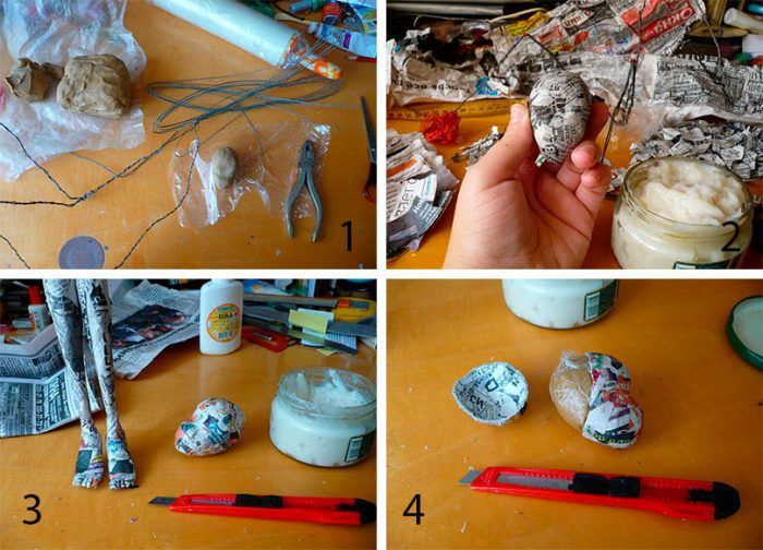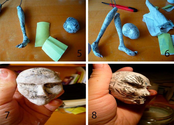 - Разточете пластилина, за да се получи топка — глава. Оформете нос, като леко издърпате пластилина от едната страна към центъра. Поставете 5 слоя папие-маше върху топката: накъсайте вестникарската хартия на малки парченца, разредете PVA лепилото с вода в съотношение 1:1. Потопете всяко парче вестник в разреденото лепило и го залепете изцяло около Главата на куклата. Оставете предишния слой да изсъхне.