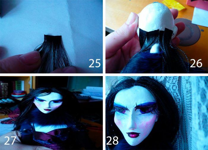 - Сложете малко пълнител в двойките конски опашки. Прикрепете косата, ресните и конските опашки към главата с лепило PVA.