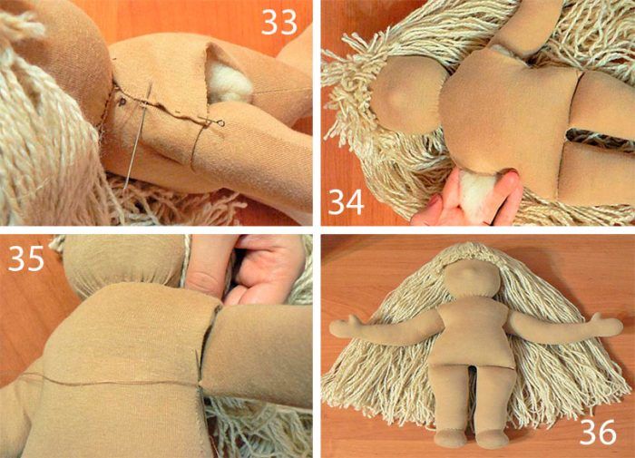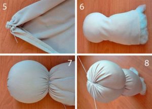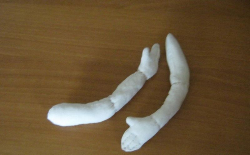 - Изрежете излишния плат от вързания чорап. Разрежете го на две равни части. Сгънете двете части по дължина и ги зашийте, за да получите две капронови филии. Напълнете ги с памучна вата — Дръжките са готови. Пришийте ги към торса на необходимото място.