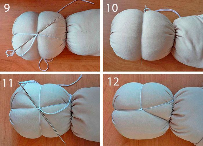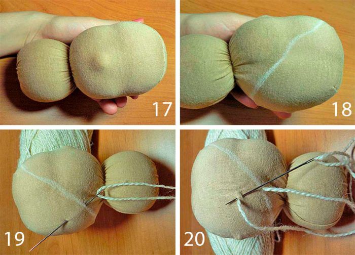 - Там, където ще бъде шията на куклата, увийте конеца 2-3 пъти около пълнената форма и завържете на възел.