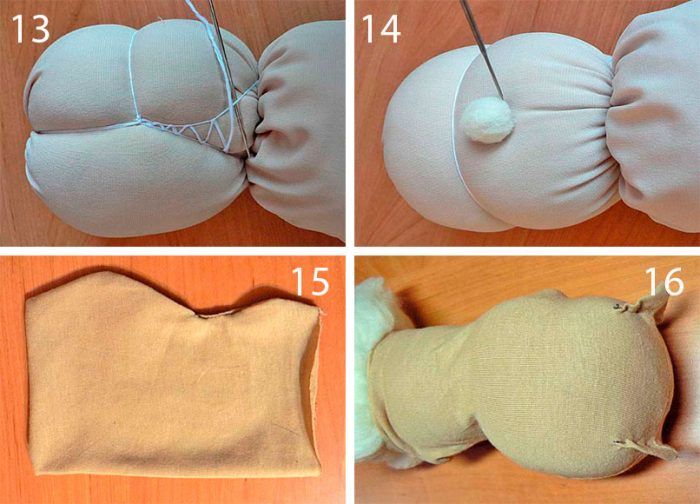 - Свържете торса с краката с помощта на въжето. Завържете възли в предната част на играчката.
