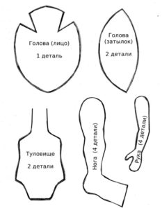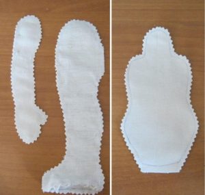 - Върху филц в телесен цвят с двоен слой бяла креда или кърпа очертайте моделите на главата с уши, торса, ръцете и краката с пропуски за шевовете. Прикрепете контурите към плата с помощта на щифтове.