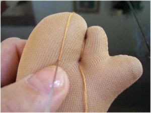 - Направете ушите по следния начин: Хванете чорапогащника от лявата страна на главата с палеца и показалеца си и го съберете с конец. Направете същото и от дясната страна — Ще имате второ ухо.