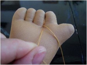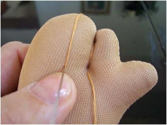 - В средата на долната част, в шева на чорапа, прокарайте иглата нагоре към корема. След това издърпайте иглата и отново надупчете реда. Леко Затегнете. По този начин ще създадете пъпна връв. В същото време върнете иглата към долния шев на чорапа и затегнете конеца там.