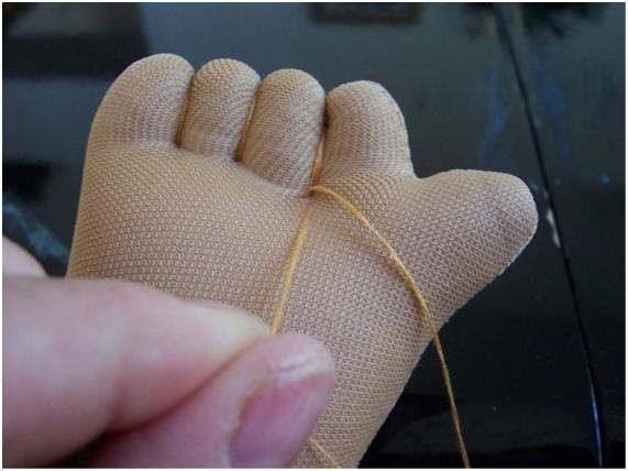 - За да изпъкне стъпалото - хванете За да изпъкне стъпалото, хванете с пръсти част от пълнения чорап и го завържете с конец. Направете същото и с другия крак.