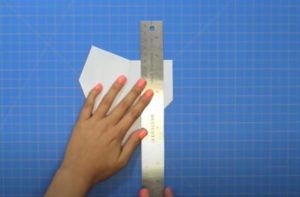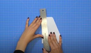 - В горния край на плоскостта измерете 1,6 cm от центъра наляво и надясно. След това измерете 2 см от долния център и съединете точките.