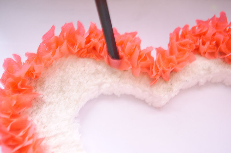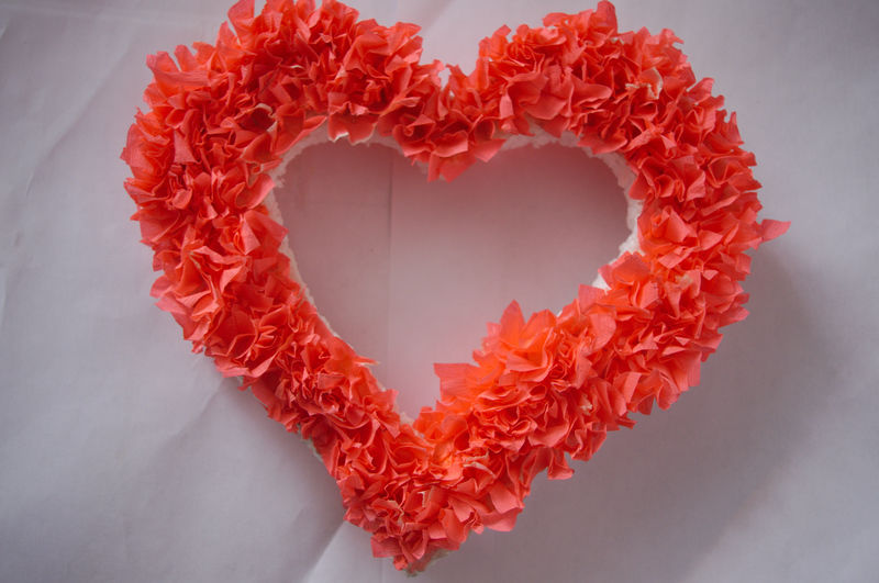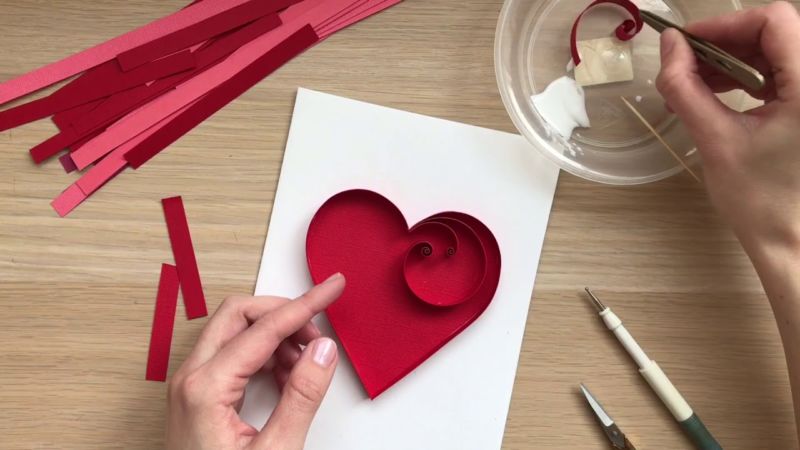 - Залепете червените навити бучки около сърцето, като постепенно запълвате цялото пространство около цветето.