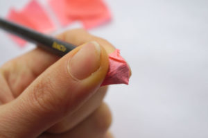 - Навийте хартия в различни цветове и нюанси на руло и я нарежете на малки парчета. Къдриците ще наподобяват нежни рози.