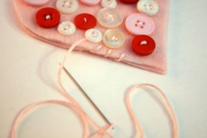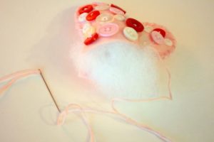- Навийте лентите на руло във формата на сърце и зашийте краищата им с телбод.