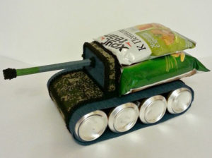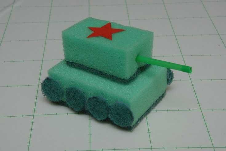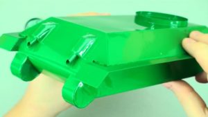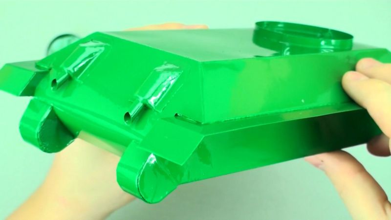 За предпочитане е да се набавят пълнители с твърда физическа форма. Нашият аналог ще използва кутийки от мачове и тръба от близалка за оръдието. Необходими са ни и два листа двустранна зелена хартия, зелена капачка от бутилка, черна и червена самозалепваща се лента: