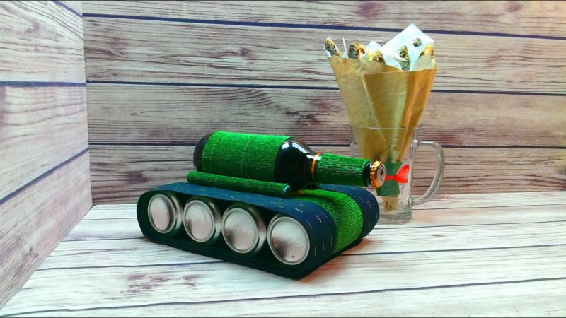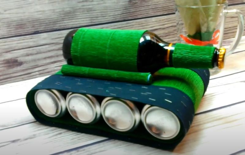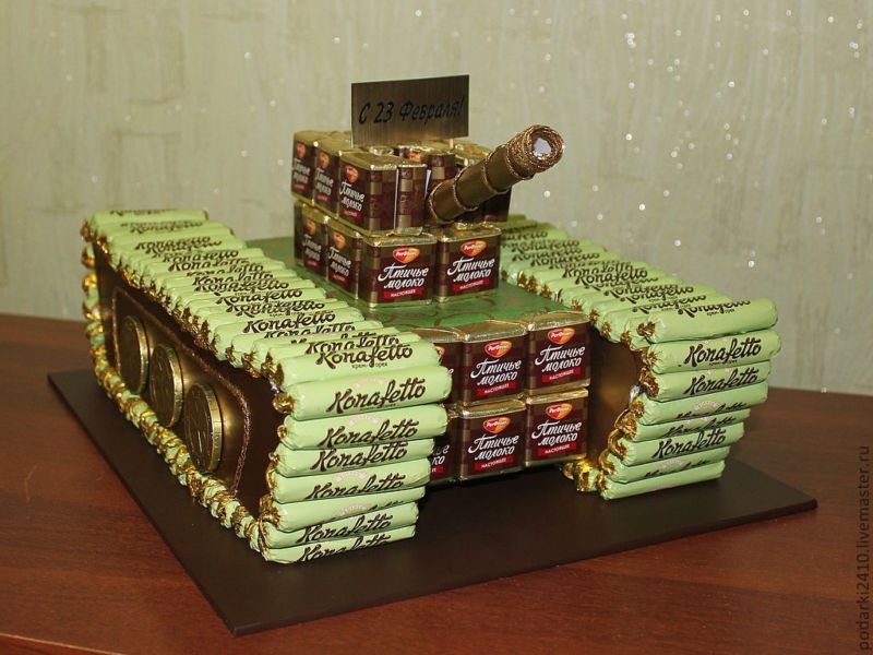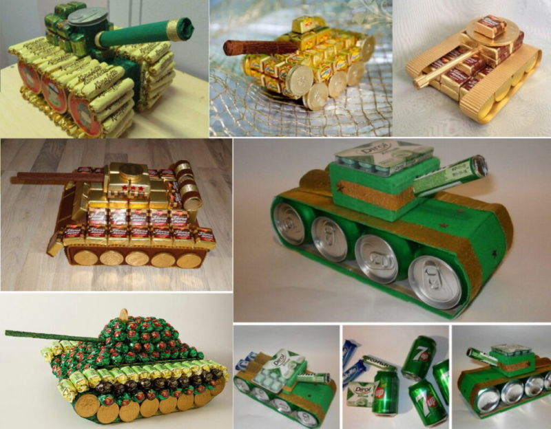 Под основата на резервоара се използва кутия, преждевременно залепена с разноцветна хартия. Горната част на резервоара е украсена с бонбони. Бутилка с алкохол е идеална за кулата. Но е възможно да се постави и пура, вафлена тръба, всякакъв друг вид тръба или друго нещо. Вместо колела се използват монети или заоблени бонбони.