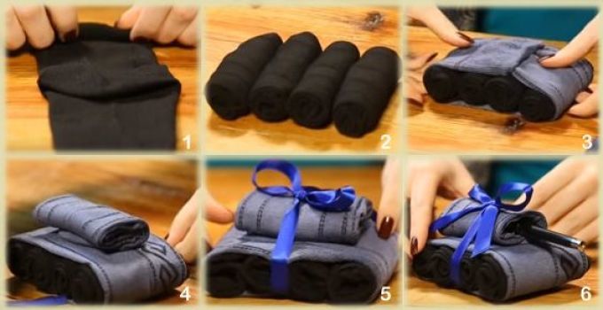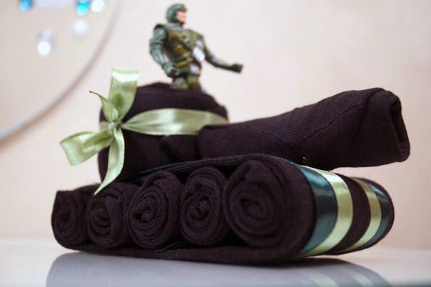 Оригиналният подарък за мъж на 23 февруари ще бъде резервоар за чорапи. Изненадата е класическа и проста, но с обрат. Необходим е допълнителен елемент като оръдие. Можете да вземете кутия бира, дълъг бонбон, канцеларски материали, пура.
