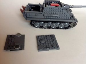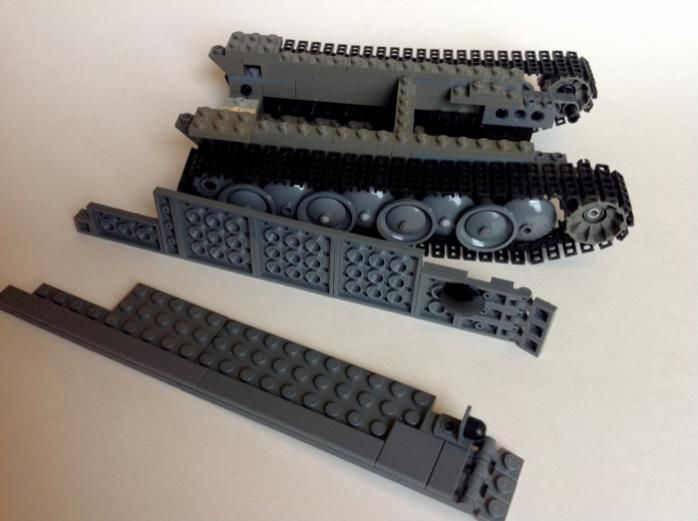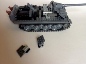 - Оформете тялото от скосените тухли. Две парчета с площ 2 и 4. Поставяме ги перпендикулярно на гъсениците;