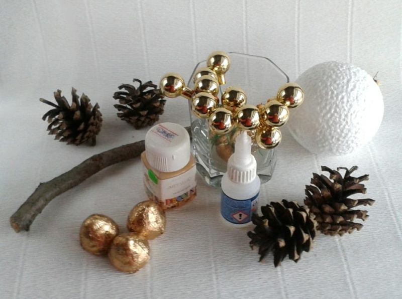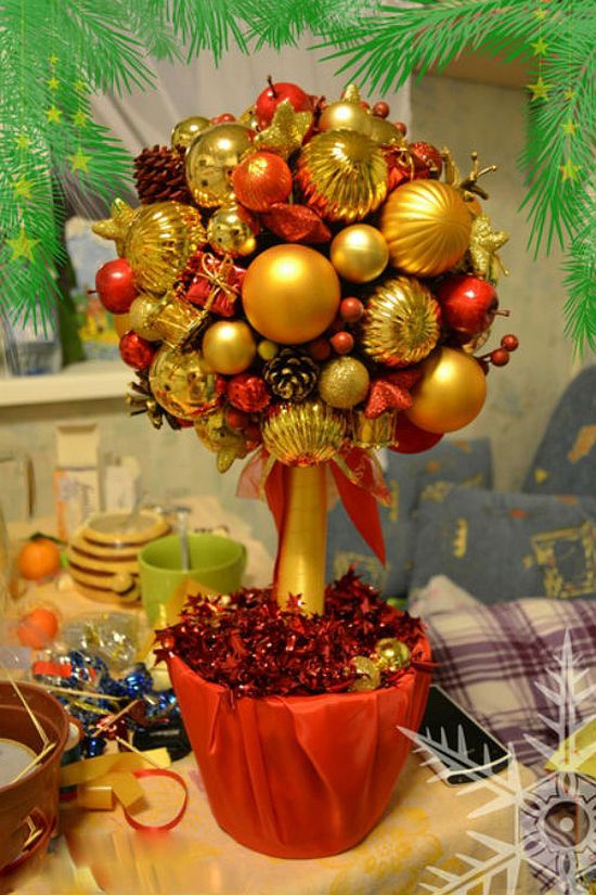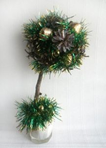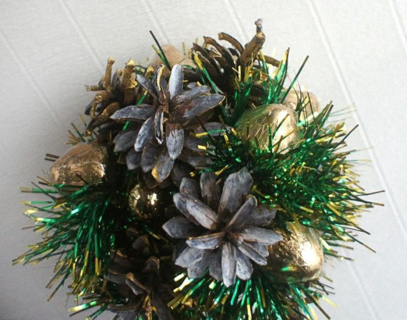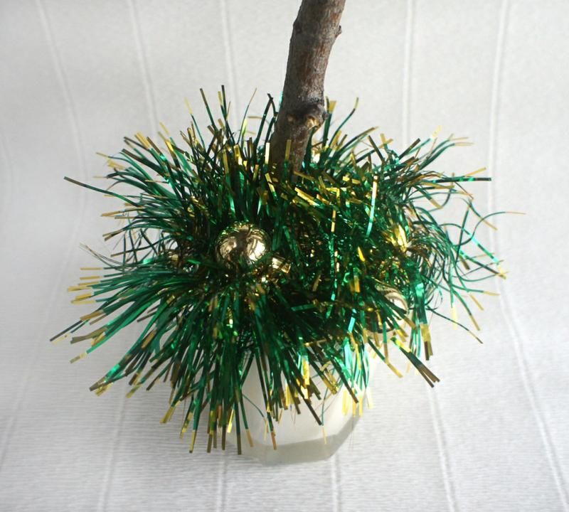 След това всяко клонче се прикрепя внимателно към основата. След това се нанизва на здрава пръчка и се поставя в съд, пълен с тежък хоросан. Закрепването е от съществено значение, тъй като ще се втвърди за около един ден. След това работата се украсява с коледни декорации.