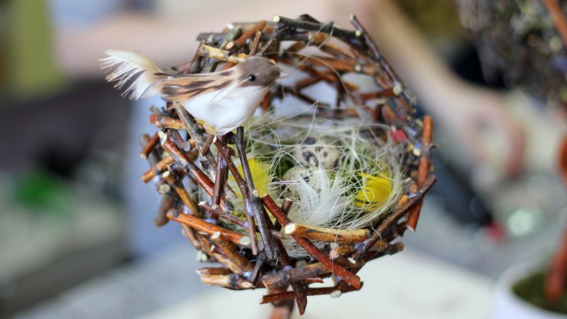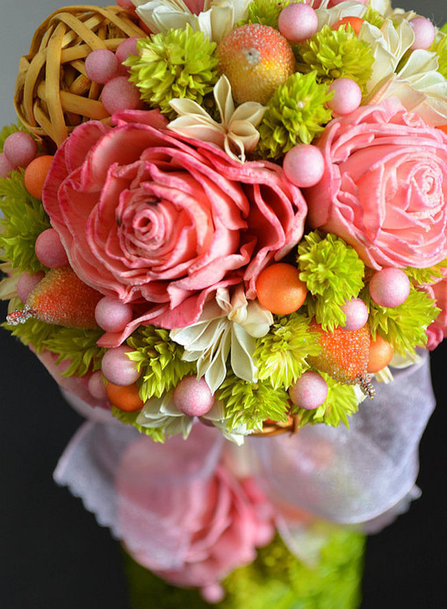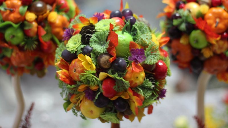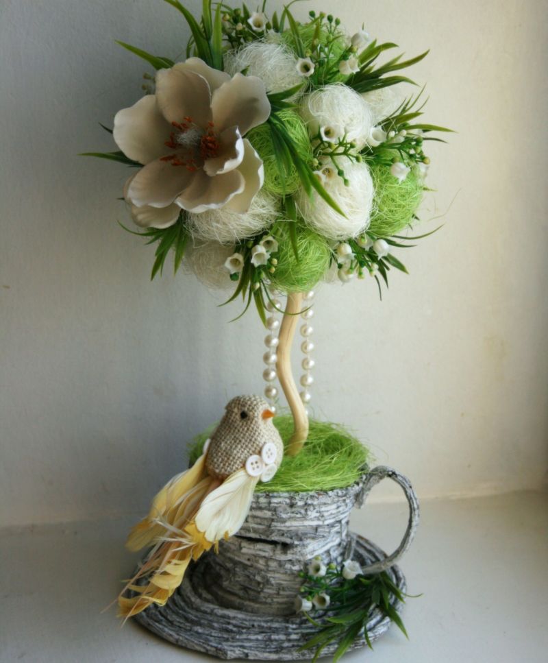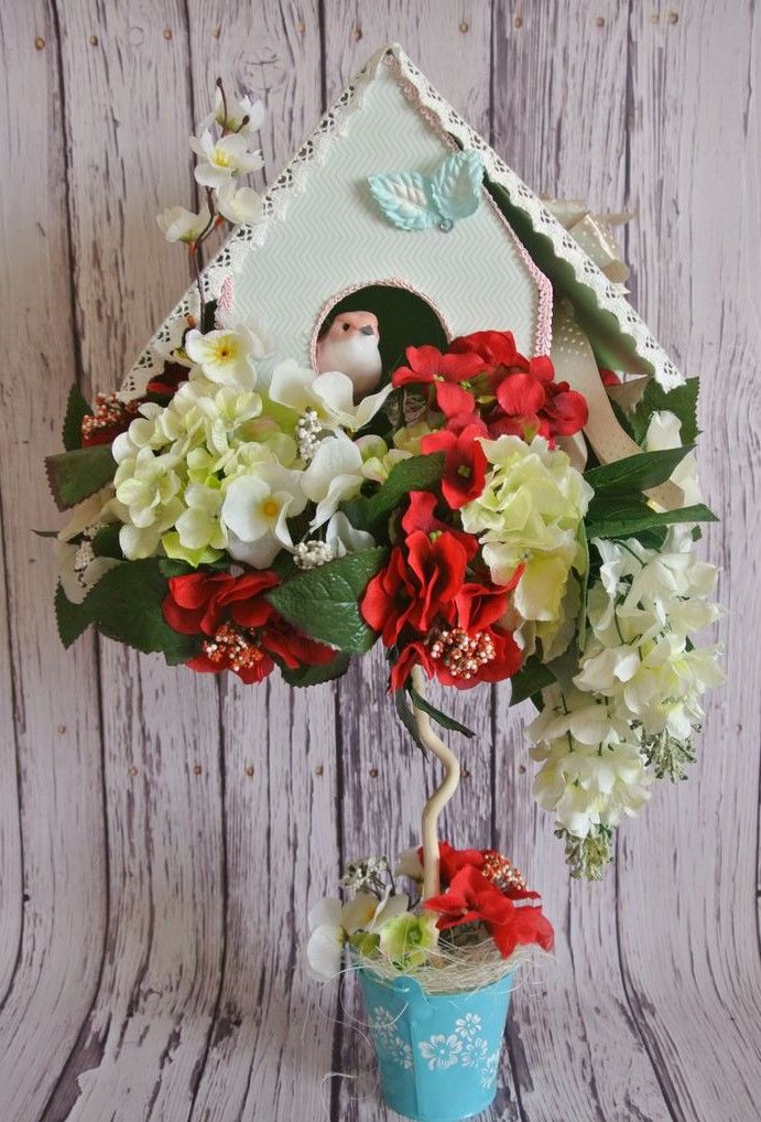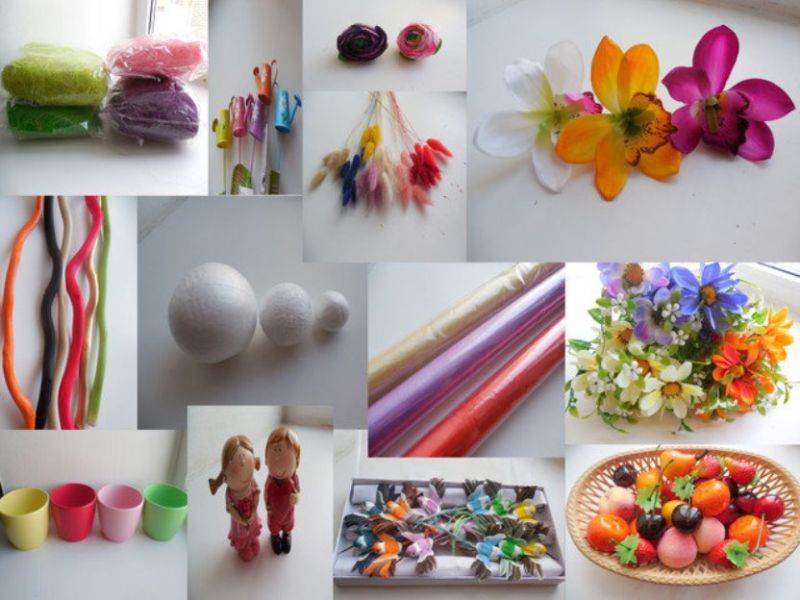 Материалите могат да бъдат изкуствени цветя, пластмаса, салфетки или естествени растения. Размерът, формата, стилът и цветът са оставени на въображението на занаятчията, който извършва работата. Подробен майсторски клас можете да намерите по-долу.