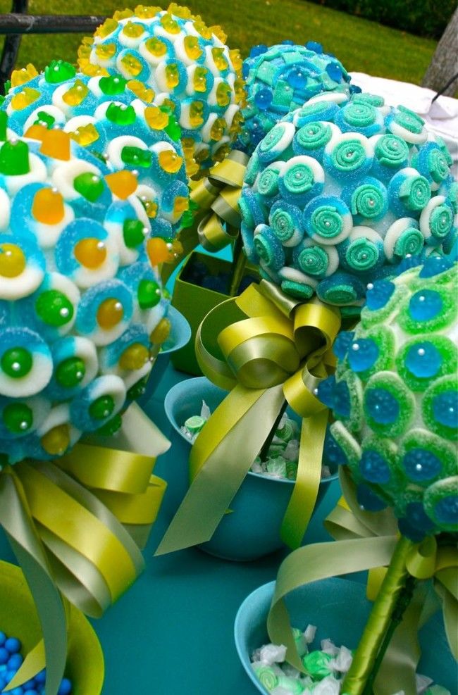 Като поставка за дизайна се използва и красива саксия. Бонбоните са тежки, затова съдът трябва да се напълни предварително с нещо тежко, например камъни или пясък.