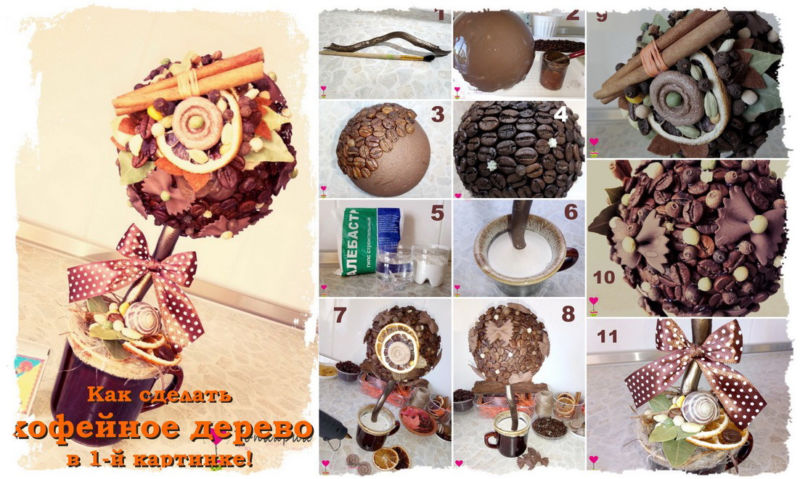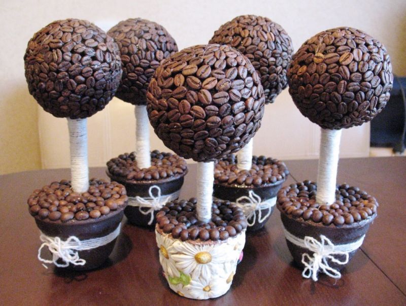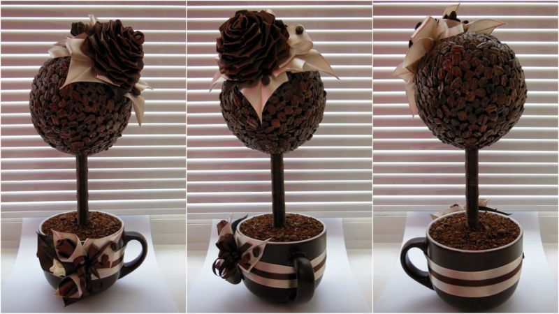 Тази опция със сигурност ще се хареса на пристрастените към кафето. Особеността е приятната миризма в цялата стая. Малко вероятно е в бъдеще да приготвяте кафе от такива зърна, но положителните емоции от процеса, майсторът определено ще получи. Как да си направите собственоръчно топиария от кафеени зърна: