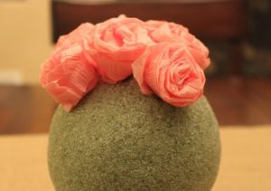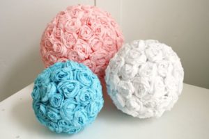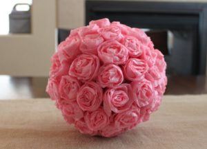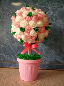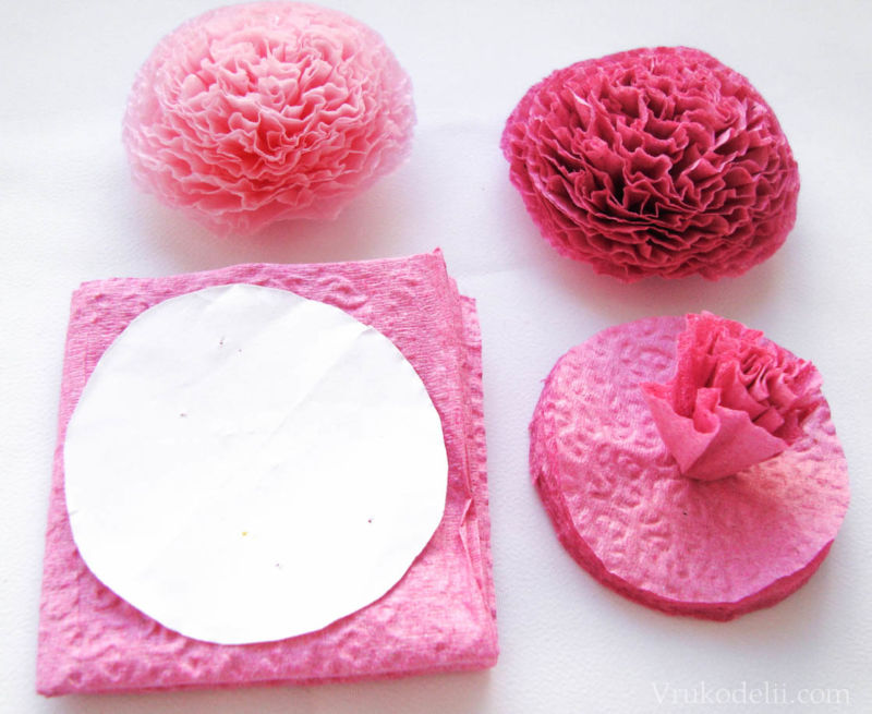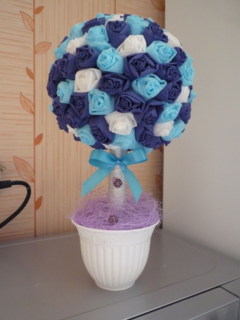 Методът е прост, трябва да направите голям брой цветя от салфетки. Един от вариантите е да сгънете всеки лист на триъгълник и да го навиете на руло. Ще получите рози, краищата на хартията са залепени и изсушени. След това всяко парче се прикрепя към шишче, което се забива в основата.