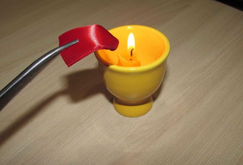 - Направете полукръгове и подрежете краищата с помощта на запалка. Направете малка гънка в противоположния ъгъл на лентата и я закрепете над огъня.