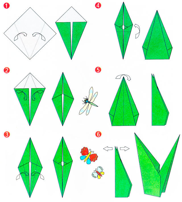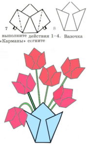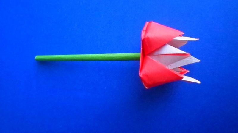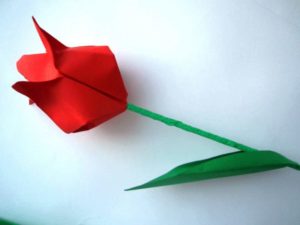 Освен самото лале, трябва да направите и нещо, върху което то ще почива. Това е стеблото. Помислете как може да се направи. Техниката е много проста: вземаме хартия, сгъваме я на тънка ивица и я поставяме в прорез в основата на цветето.