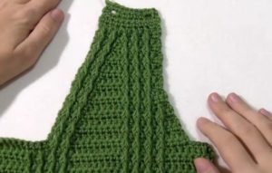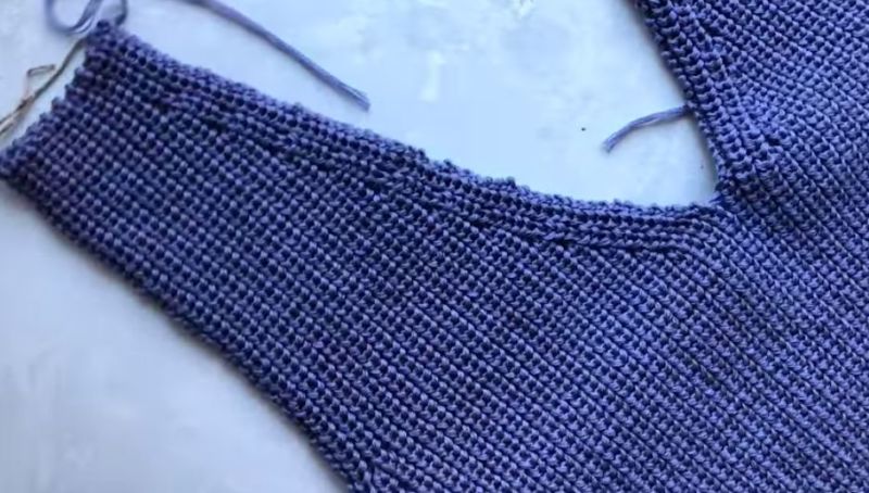 За цялостно изплетеното деколте затворете раменните бримки, като оставите презрамките непокрити, и изплетете презрамките до половината от ширината на задната част. Не затваряйте примките на лентите, а ги изваждайте с щифт.