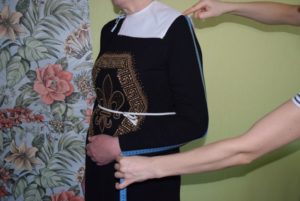 Когато се сглобят, лентите от двете половини се съединяват, закрепват се и се пришиват към врата на гърба.