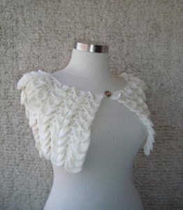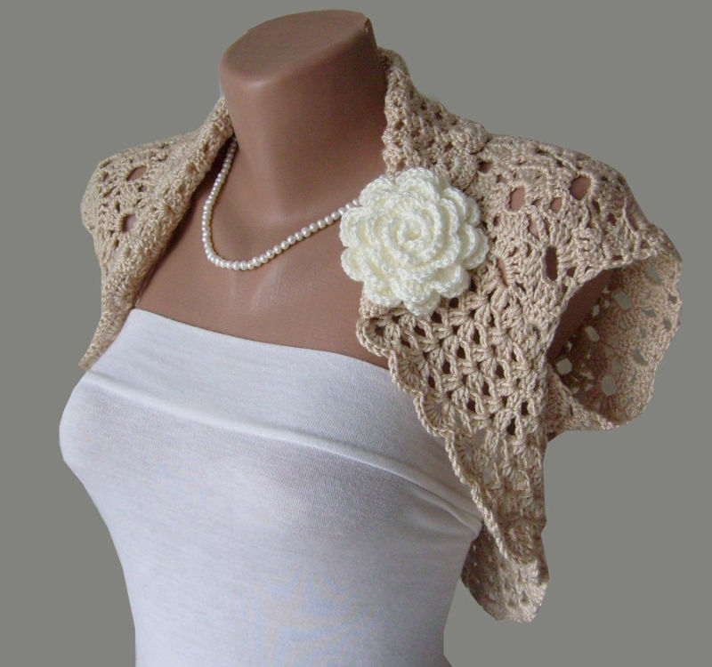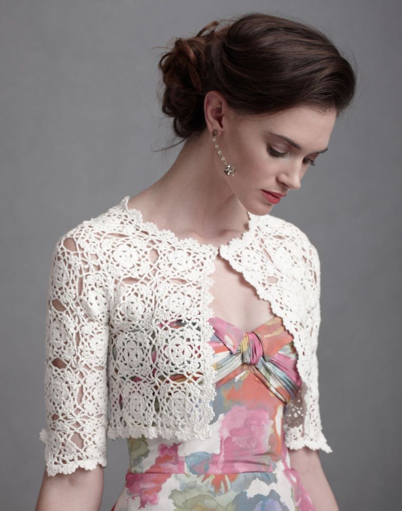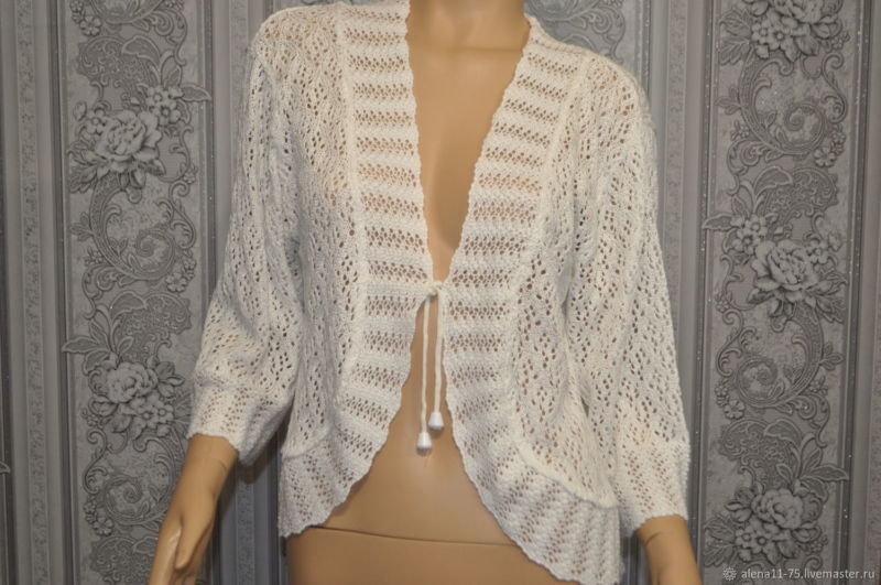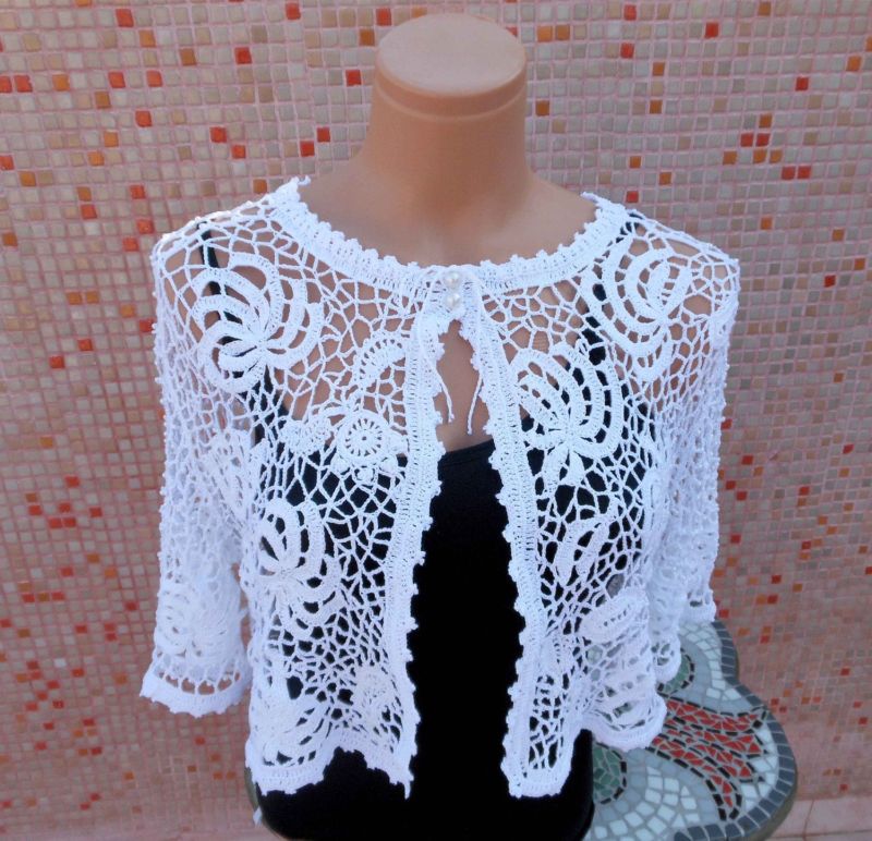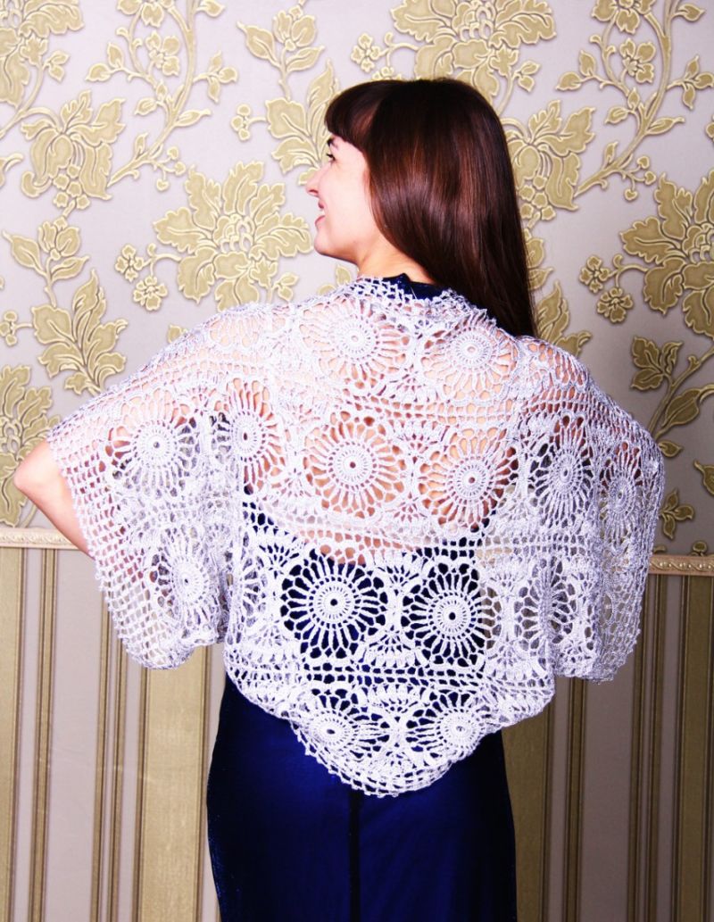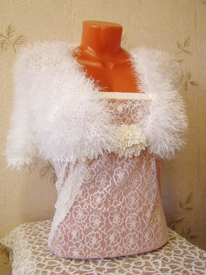 Бялото "палто" се носи върху отворената сватбена рокля през студения сезон. Плетена без закопчалка, но можете да закопчаете предната част с брошка или галантерийна фиба.