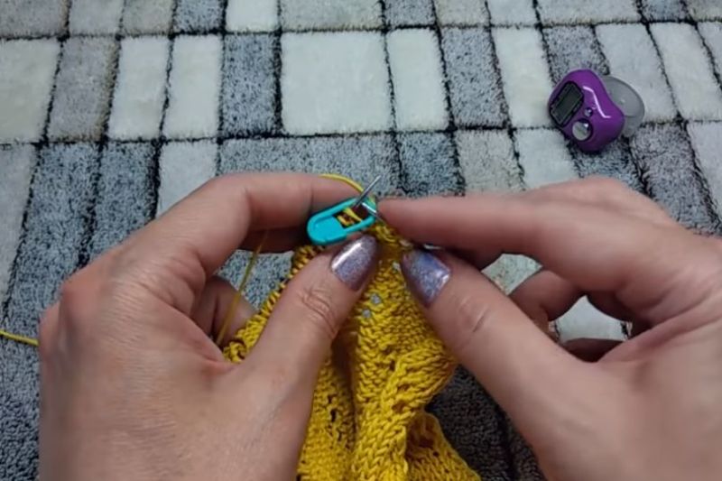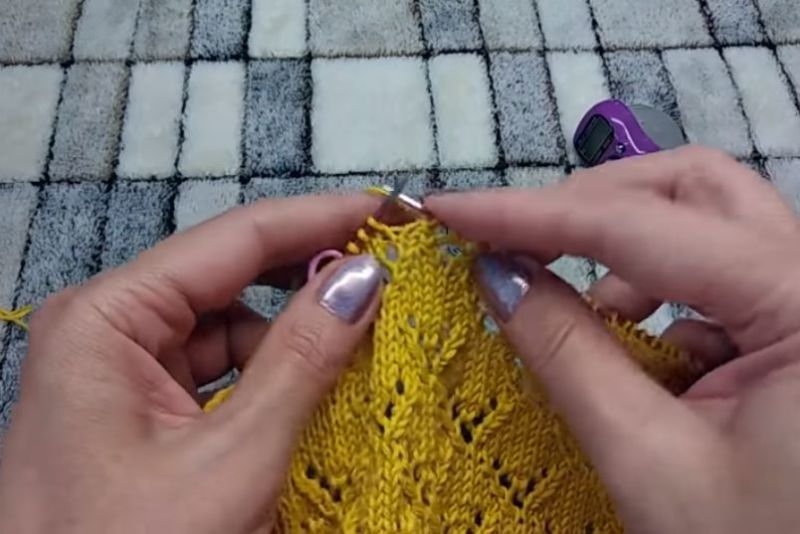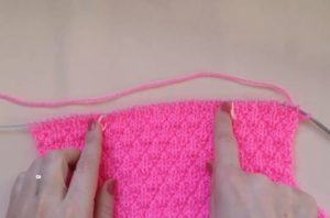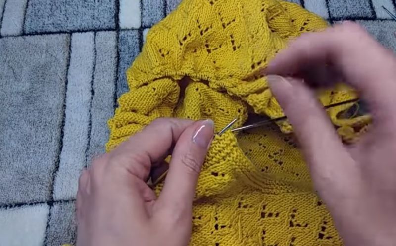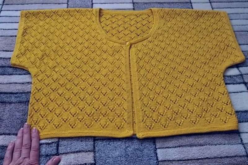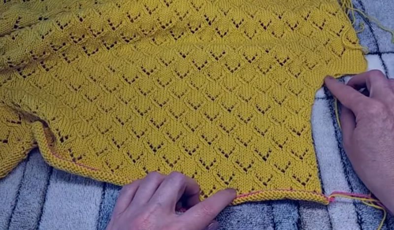 Те излагат модел на дъното на модела, направен с точния модел, като определят колко ще се поберат по ширината на гърба, рафта или ръкава. Това е най-точният начин за определяне на броя на бримките в първия ред. След това изплетете гърба, рафтовете и ръкавите.