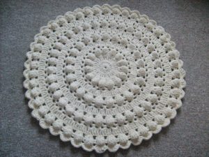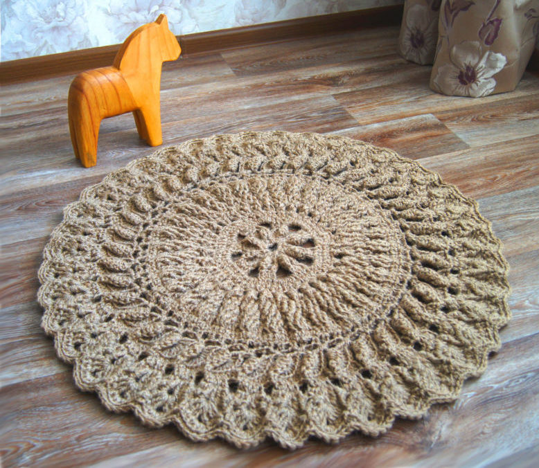Мотивите могат да бъдат изплетени в един цвят, но с ажурни елементи. Например правоъгълен килим от канап с комбинация от мотиви на големи и средни кръгове.