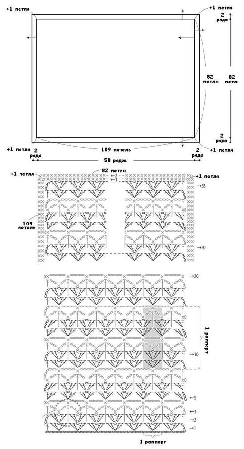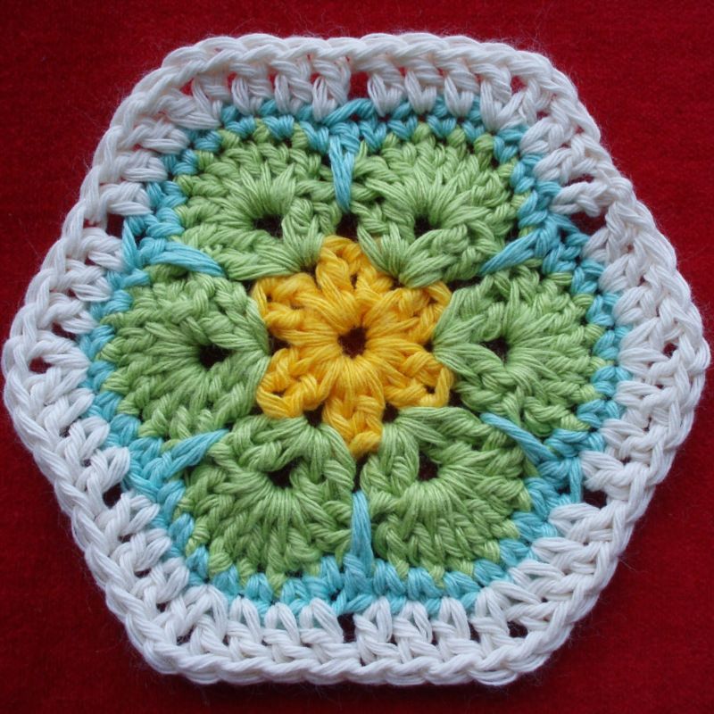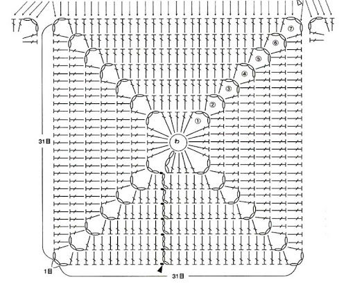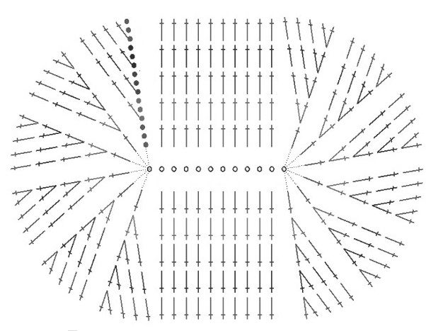 При тази сложна форма се използва техниката "квадрат на баба", при която платът е съставен от няколко свързани парчета. Закачете 8 въздушни примки, след което ги сплетете с полуоко в кръг. Останалите редове са съставени от нулеви бримки и въздушни бримки.