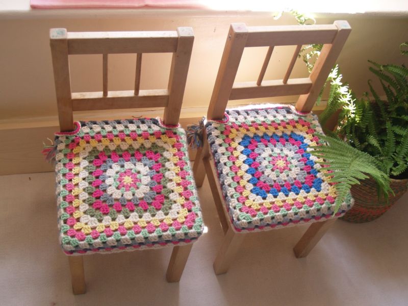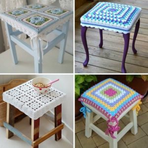 Дървените столове и табуретки могат да бъдат покрити с квадратни килими, изплетени от центъра на кръга. Те се изработват без шев или с шев на предните стени. За да се получи квадрат, във всеки ред се правят допълнения към ъглите: под формата на 2 колони, въздушни бримки и две колони.
