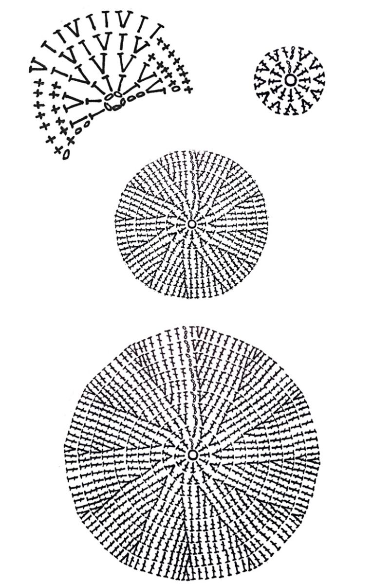 Правилната кръгла или триъгълна форма се изработва по метода от центъра. Важно е да добавите правилния брой бримки във всички редове навреме, като следвате схемата на модела, за да не се мачка полученото изделие.