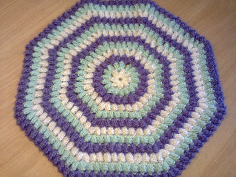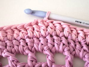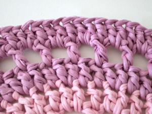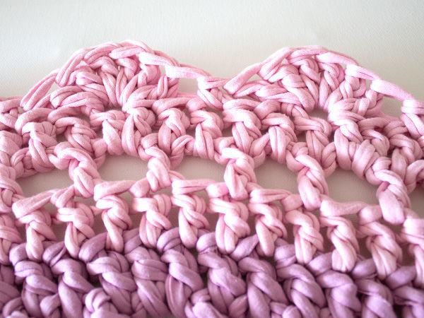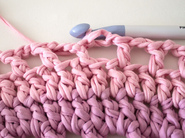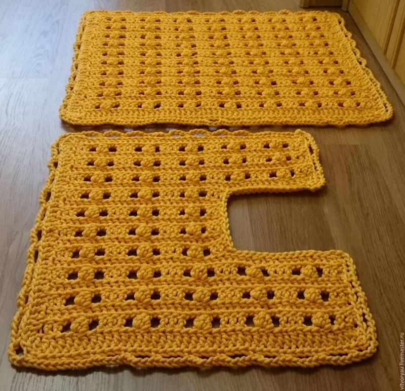 Използва се за коридори и бани. Най-практична е употребата на полиетиленови прежди. Започнете с верига от въздушни примки, равна на ширината на изделието. Продължавайте да плетете следващите редове без задна или предна бримка, докато получите квадрат.
